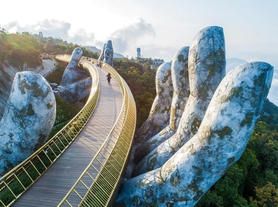 The Golden Bridge Cau Vang is the park's centerpiece, featuring two massive stone hands emerging from the mountainside. I recommend visiting this first thing in the morning; by 10:30 AM, the bridge is often so crowded that taking a clear photo becomes nearly impossible. During the rainy season considerations, the bridge is frequently enveloped in thick fog, which adds a mystical atmosphere but obscures the view of the valley below.